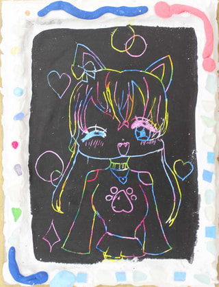 さくらちゃん3年生。まわりは紙粘土、黒いところは石膏です。鉄筆でスクラッチして3原色で着彩しました。可愛いですね。