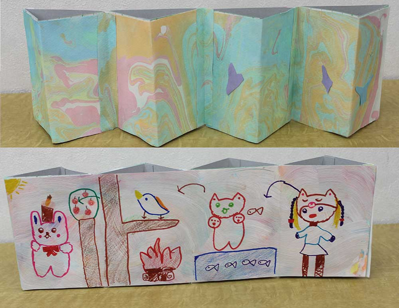 アトリエでマーブリングは初めてでした。せなちゃん3年生。時間がある子は背面に絵を描きました。